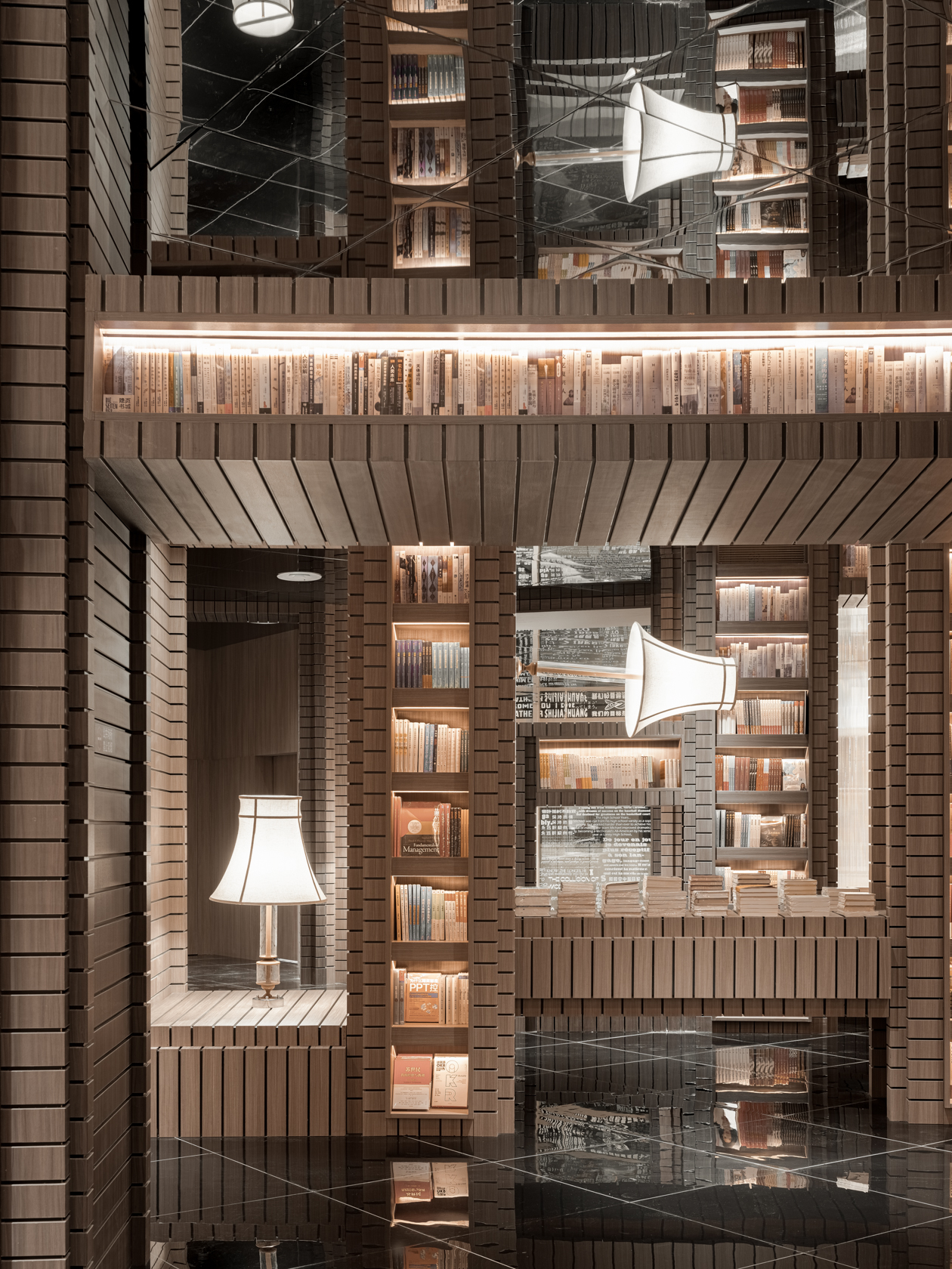 Tracing the city's cultural lineage, the designer transplants the concept of Shijiazhuang's precious ancient city wall on the bookshelves in the Concept Area, with layers of bookshelves connected, using the smallness of the bookshelves to exemplify the largeness of the city wall, building a castle of knowledge guarding wisdom. The overall space adopts light and dark walnut colors to contrast with each other, forming a harmonious and rich visual layer. Take a book and sit on the bench against the buttress. Look around and you will sense the charm of antique from the city wall reflection on the black floor and the mirror ceiling. You can also take a book into the quiet tea room, where the scent of ink and tea intertwine to create a gentle and healing space.