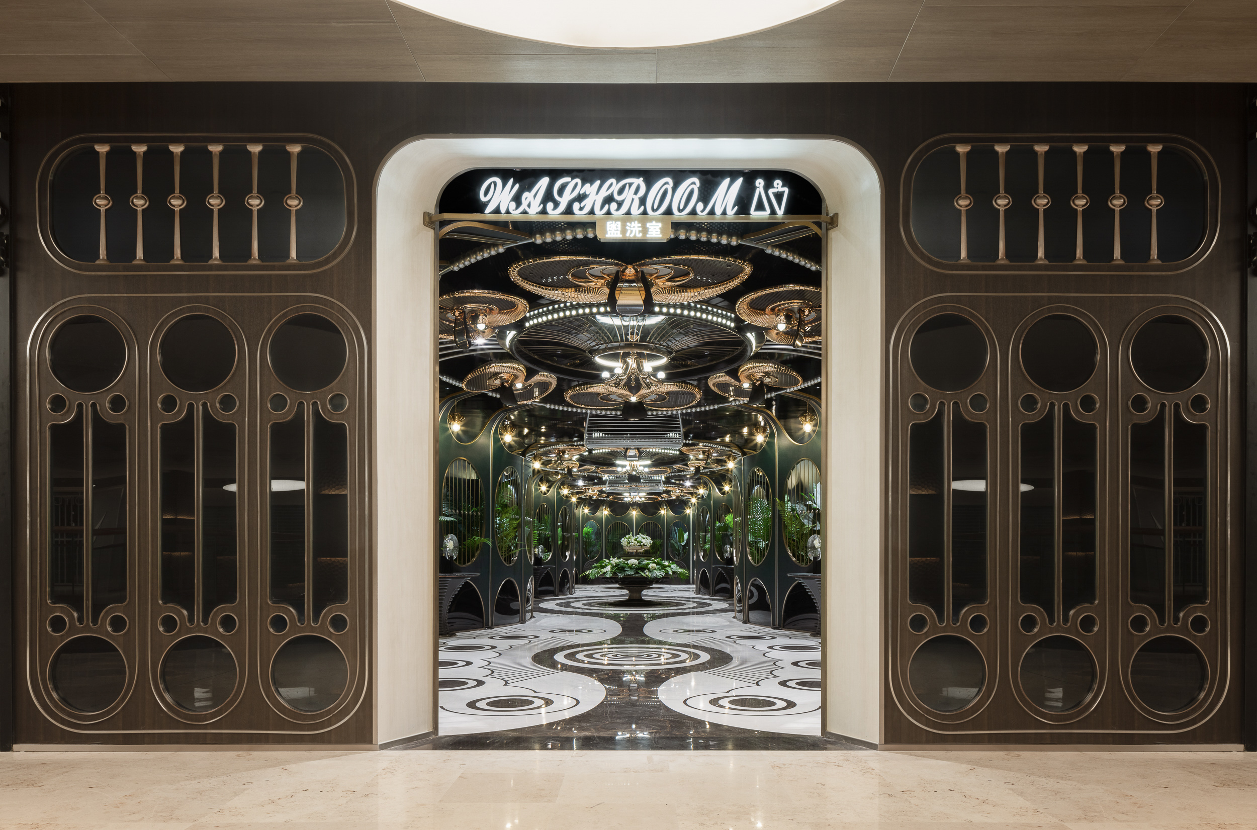At the end of the experience hall is the traffic point for the separation of men's and women's washrooms - the lounge, a group of large art sofas grow out of the space like a cluster of brightly blooming flowers. While its design falls in line with the theme, the sofa itself provides a convenience resting spot for the waiting visitors. The logo of the men's and women's washrooms is interestingly expressed with "rose" and "palm leaf". In the washroom, the washstand is inspired by the fountain in the garden. functionality is properly integrated by taking advantage of water fountain's shape and height difference. The designer continues to follow the same design strategy as the experience hall, using wood veneer and champagne-gold grilles as the double skin of the interior, emphasizing the sense of comfort and convenience of the space, and ensuring the unity of artistic style and control of the theme aesthetics.