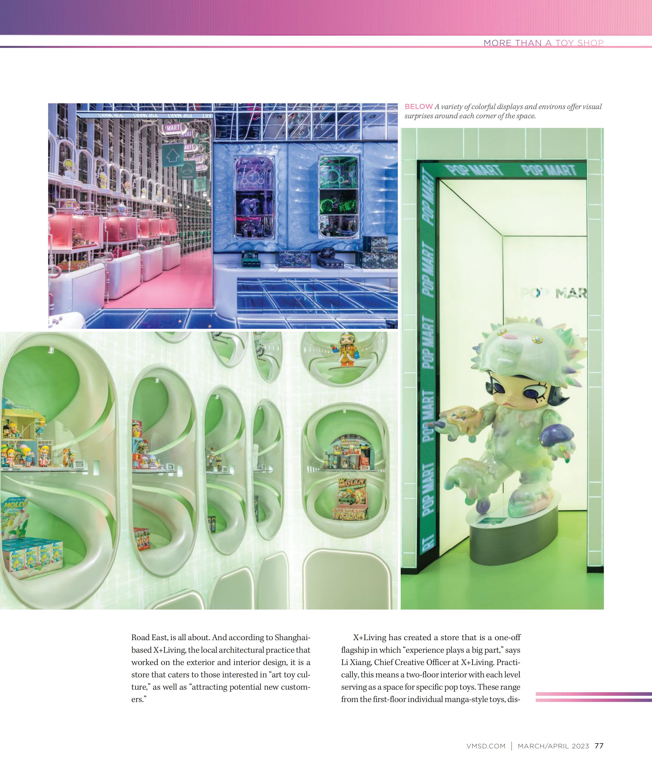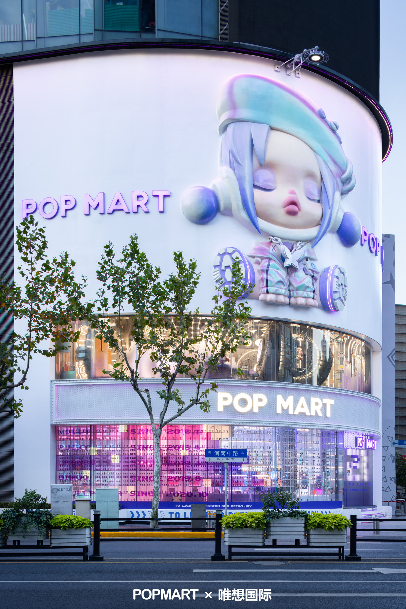 The project is located at the busy crossroad of Nanjing East Road, The designer took advantage of the unique opportunity for display and created a giant storefront of four floors high. Brand logo and product elements are exacted to design a simple yet fantastic and impactful decorative façade, which radiates the brand's unique identity to the whole block, and creates a landmark pop toy culture experience center.