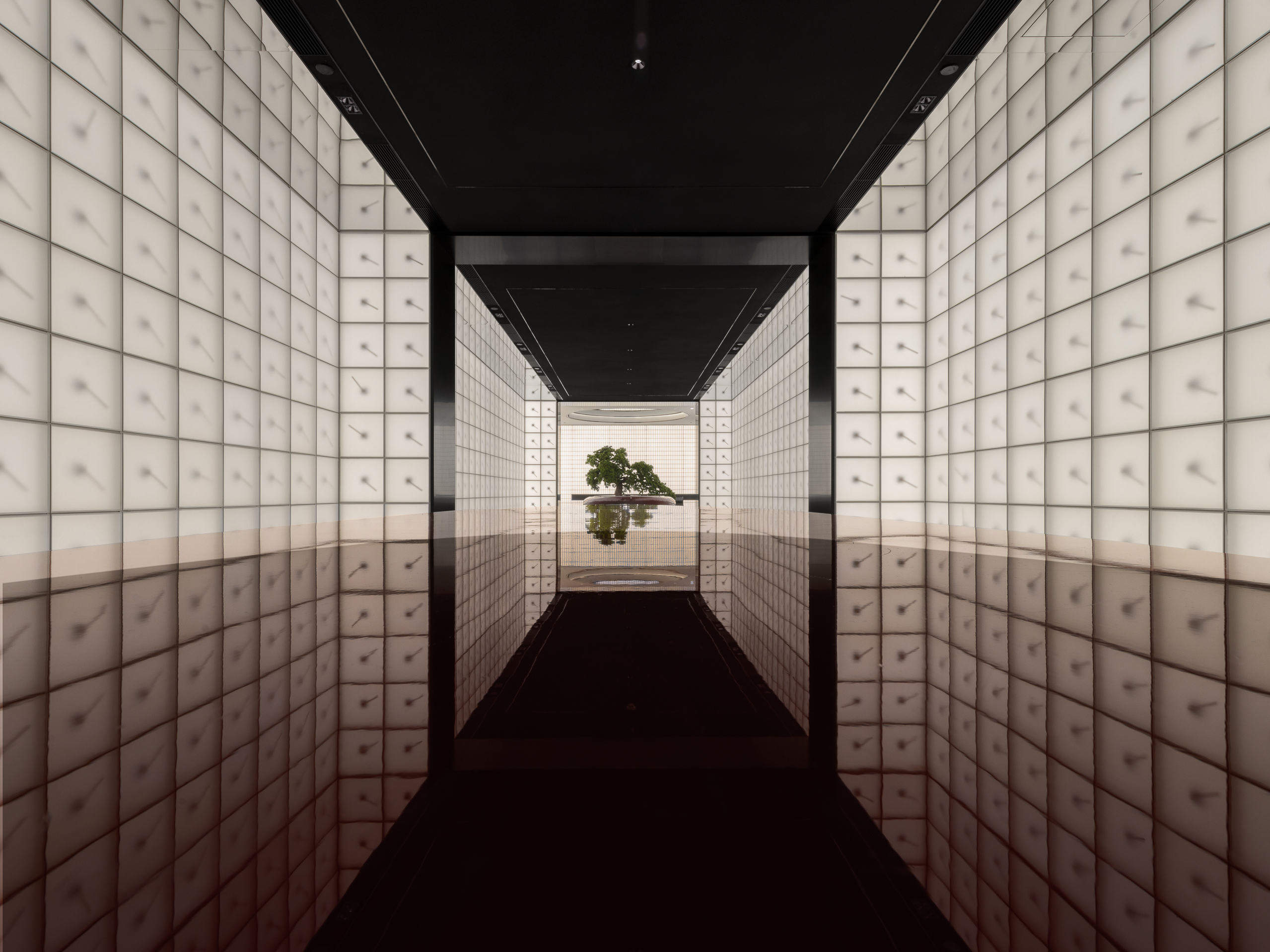 Flowing with the water, pointing to the indifferent painting inside the doorway of the experiential hall, depicting the poetry of pines. Here lies a marvelous method of turning the abstract into reality, where stepping into the painting means entering the garden. Taking a leisurely walk into the courtyard, a pool of flowing sand supports the lush pines. The circular holes in the ceiling open up the space, connecting the inside with the outside. The mirror reflects like water ripples, portraying the scenery in the courtyard. In this place, there is an elegant and poetic ambience.