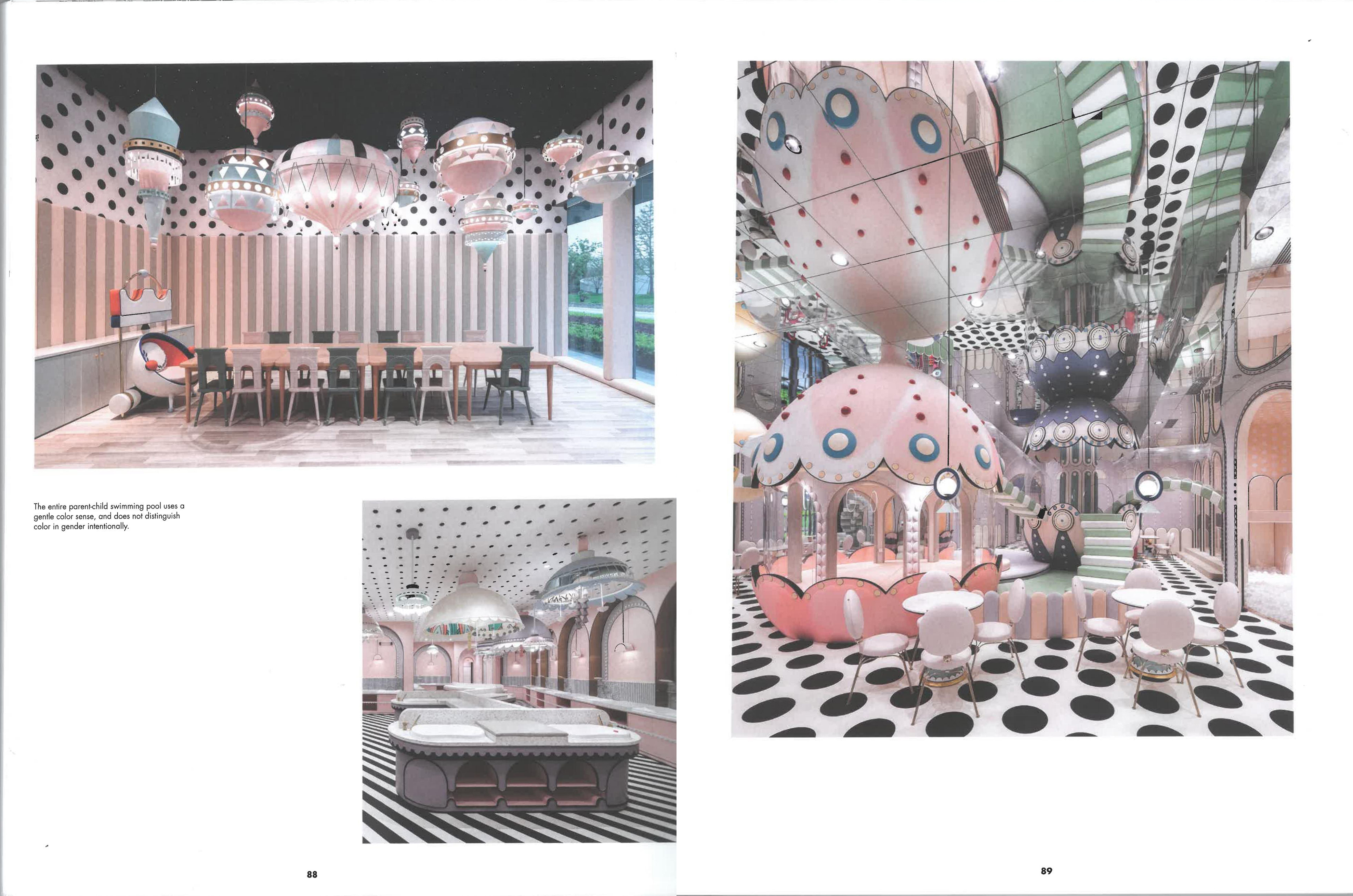 整个亲子游泳馆仅采用了温柔的色感,并不刻意做性别上的色彩取向区分。黑色细线描边的设计手法,给整个略显轻飘的空间底色增添了几分时尚先锋感,从构图上来讲,同时也成就了平面美学。 从小至两厘米的圆拱形花边到挑高三米的圆拱弧门,统一、极简的设计元素,通过大小比例的调整运用,从大尺度覆盖到小尺度,构成了空间中的美学比例逻辑。 无特别照明的设计,意图强调整个空间无重点便是最大的重点,以打造一种沁入式的梦幻体验。