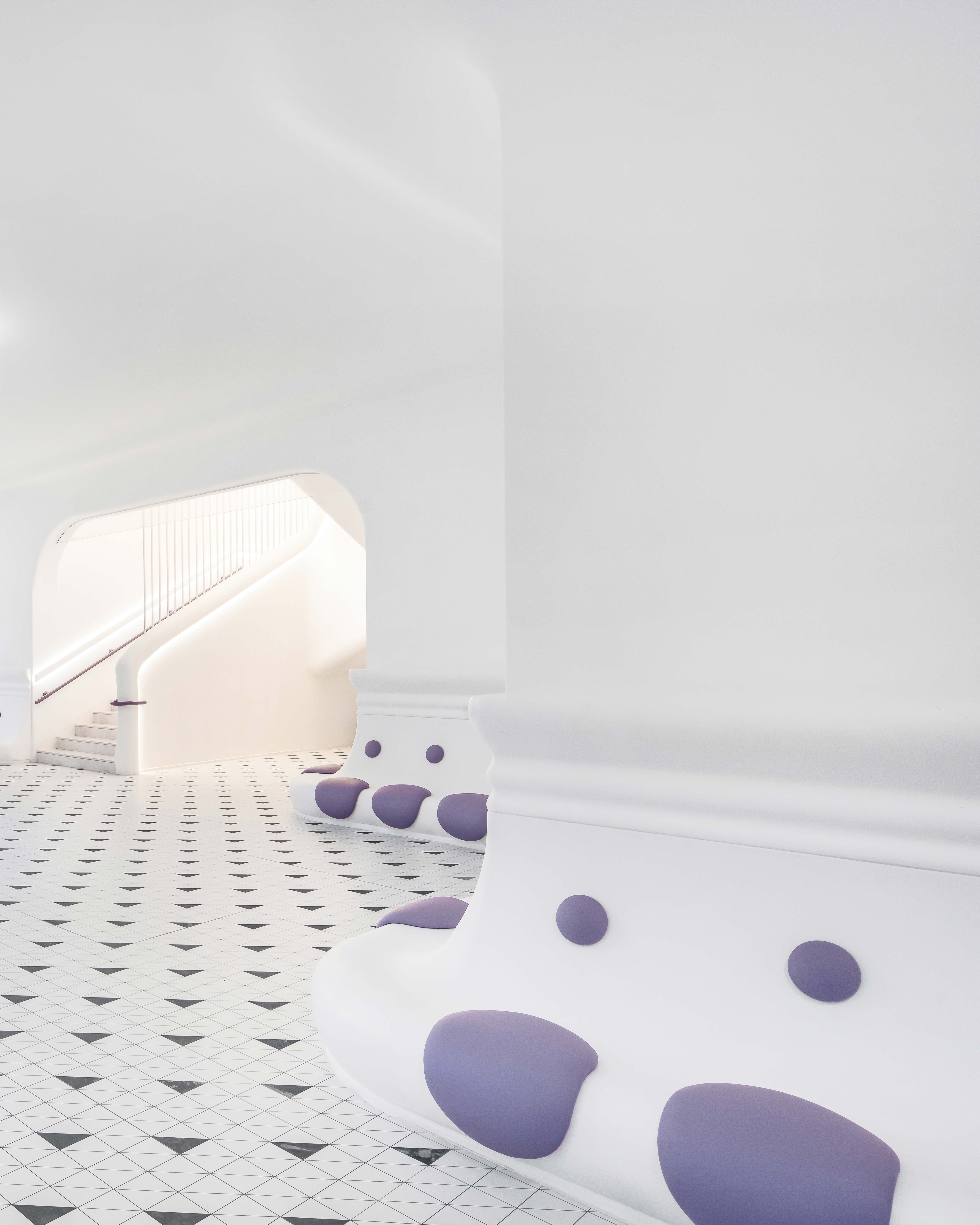 设计师在空间中大量利用建筑中的微笑曲线,因地制宜地变换了不同的尺度,勾勒出软篷篷的云朵形态。同时也借鉴了建筑师高迪对细节处的精细刻画以渲染仪式与隆重感,作为孩子们的想象力触发点。