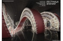高尔基说过:“书籍是人类进步的阶梯。”拉斐尔也曾在名画《雅典学院》中让代表着哲学、数学、音乐、天文等不同学科领域的文化名人会聚于阶梯前探讨知识。设计师提取出智慧阶梯的美好寓意,将论坛区典雅庄重的书架整合为绵延的阶梯,砌筑出神圣的知识殿堂。叠加的门洞造型和富有层次感的地面动线言明了知识殿堂丰富多彩,深邃宽广的精神内核。简洁的灯具散发出柔和的光线烘托整个场所的温暖氛围。充满悬浮感的摆台丰满了超现实主义设计的骨肉,带给读者一些奇幻的想象与感受。