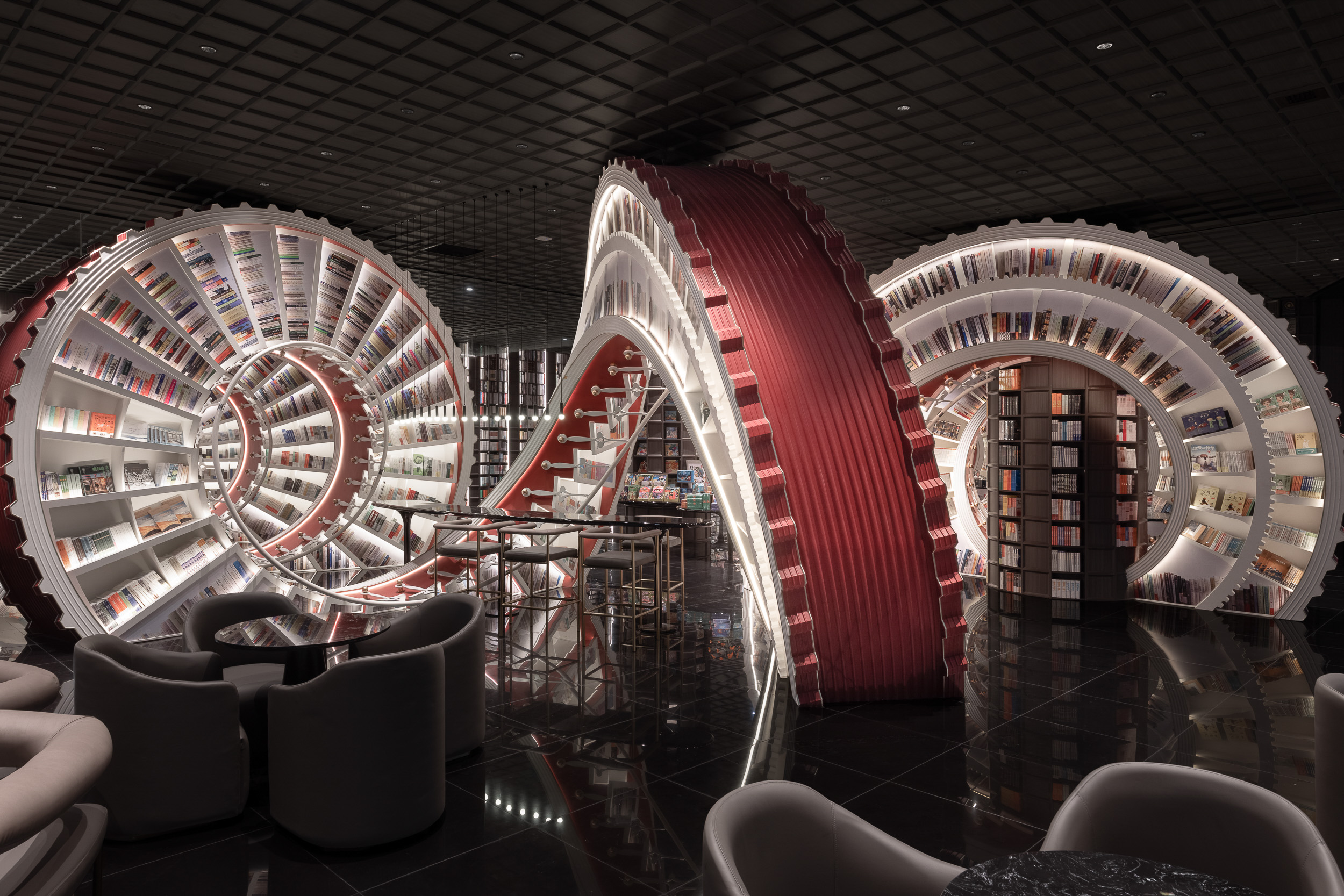 概念区坐落于建筑一角,大面积的玻璃立面打破室内与室外的空间隔阂,消解内外景的边界感,提升空间的广阔性,让消费者从室外也能欣赏这个依托于巨大艺术装置的零售空间,框景的树立描绘出包容开放的故事磁场与城市气质。时间在这个充满艺术性的空间得到具象化的呈现,庞大的螺旋阶梯书架侧卧于地面,以一道曲线的轨迹贯通整个概念区,沟通两个出入口。当顾客从正面凝视这座螺旋阶梯,就可以观察到一个个时钟表盘形状的切面,钟表指针式样的扶手具有双重语境含义,承担阶梯扶手功能之外也在表盘上投影下指针轮廓,暗喻出这是一座由无数时间累叠而成的历史之梯,传达出历史被快速推动的时间流动感。空间也被恰当分割,营造出较为独一的空间格局,带给读者良好的私密阅读体验。螺旋阶梯,既是承载功能陈列书籍的书架,亦作为内空间一个庞然的艺术巨构装置,中和了浓厚的商业意味,提升了场所魅力,像一个巨大的寓言待人探索其中的真谛。“光阴可惜,譬诸逝水。”摆台如水般连续流动的轮廓外形,内蕴着时光荏苒的含义,勾勒出曲径通幽的室内动线,让读者体味空间中的时间流动,心境如水,获得润物无声的疗愈感。