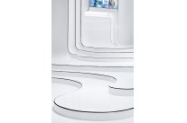 开放的空间形态中,大面积温润的白和纤细的黑线形成强烈对比,牵引视线,蜿蜒的曲线构造破除一眼到头的无聊,经由重新规划的行为动线增添趣味。高雅静谧的白色主色调宛如一张纯净画布,过滤杂质,隔绝干扰,从本真中生出斑斓色彩的展品与电子屏幕,营造沉静舒适的观赏氛围,专注于享受作品带来的艺术感受。折叠极简造型的接待台将参观者引导至电子艺术品的巨大屏幕前,运动变化的形态与相近的闲适水池共同探讨静与动的辩证关系,是主题展览的先导体现。