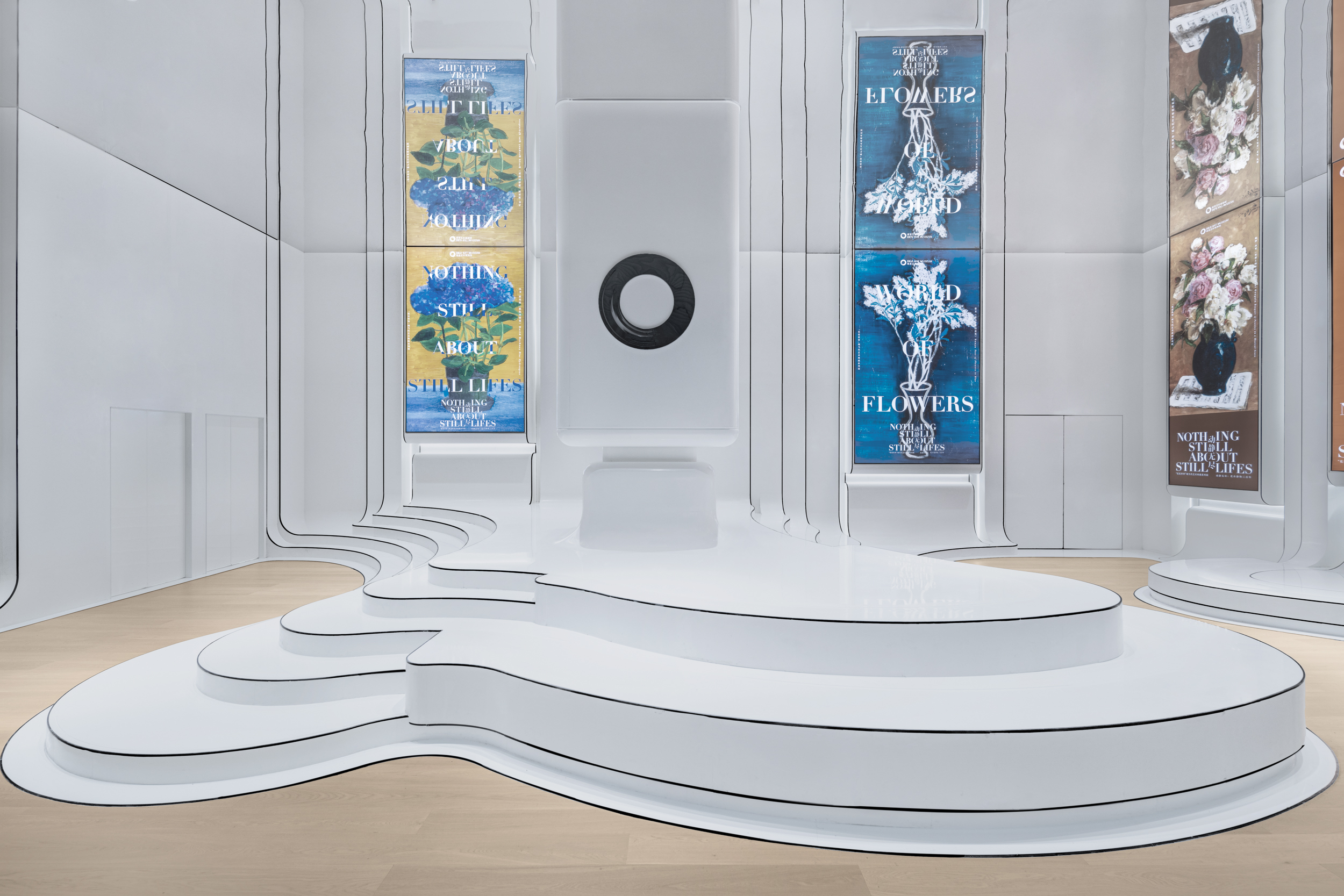 而纯黑的线条赋予了纯白色块形状与动感,勾勒出层叠延伸的弧线。曲线在墙面自上而下流淌,地面明确的界线被消除,流水淌入原野,泛起阵阵涟漪。川砥生出花来,不同时代名家们的花卉作品于此间绽放,模糊了时间。外部长廊与内部展厅的边界也随之融化,双流线构造的参观路径带来双重艺术陶染的全方位观展体验,展现品牌“跨越文化与时代边界”的立馆使命。
