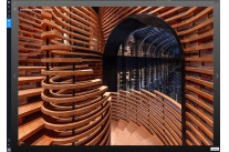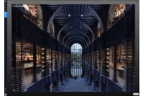 建筑的中央,贯穿三层的深蓝色钢板层级铺衍,色彩从天津港口的海水中采撷,更加细腻的切割形态则暗合海浪叠荡,海纳百川的精神与天津的城市气质互为注解。巨幅拱形门洞递进向上,仿佛海潮翻涌起圈圈波纹,寓意着书籍对知识的传播与扩散。