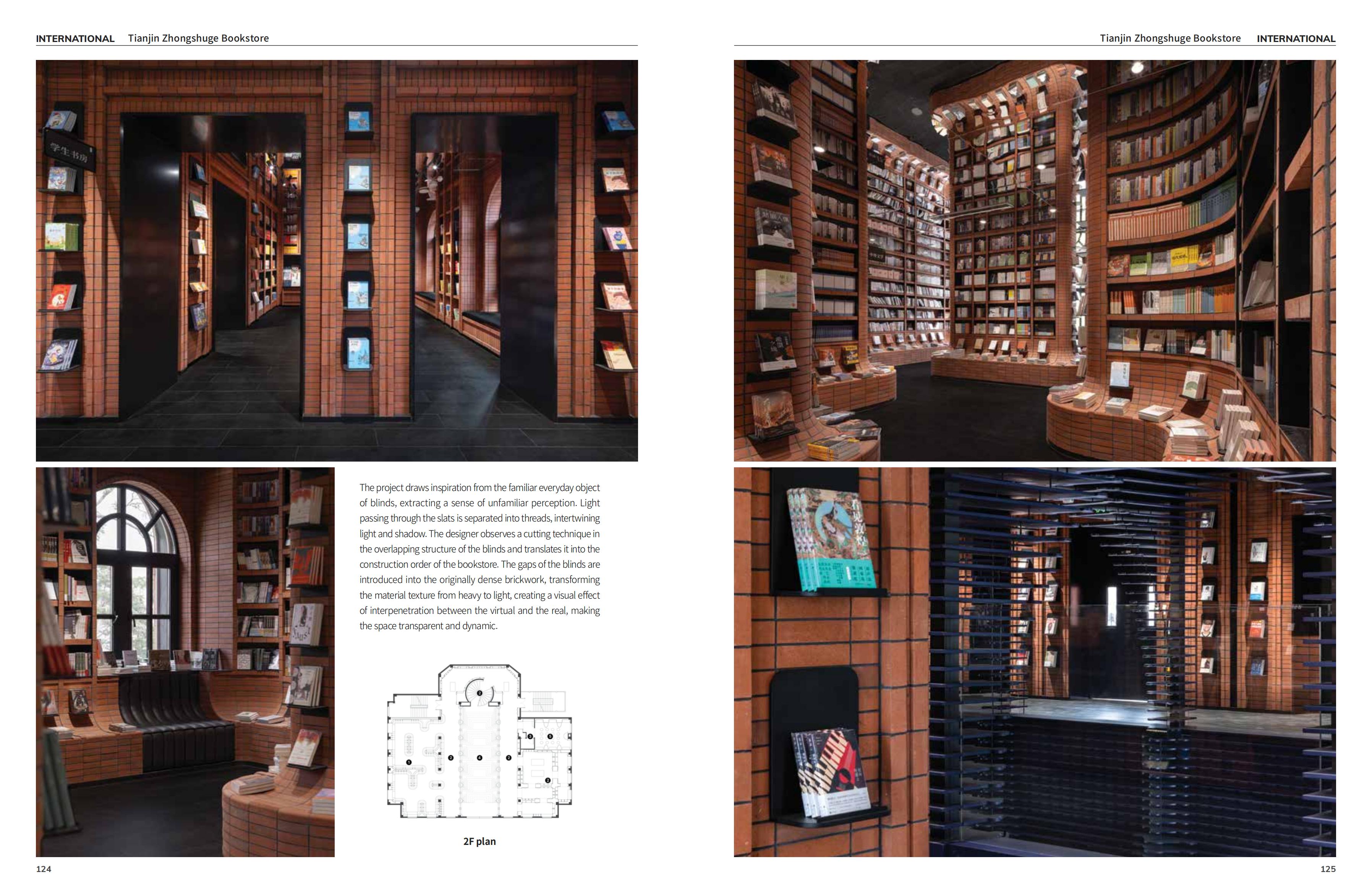 项目灵感从百叶窗这一熟知的日常物件中,分离出一种陌生感知。光线穿过窗叶被分隔如缕,明暗交织。设计师在窗叶的交叠结构中观察到一种切割的手法,并将之转译为书店的建构秩序。