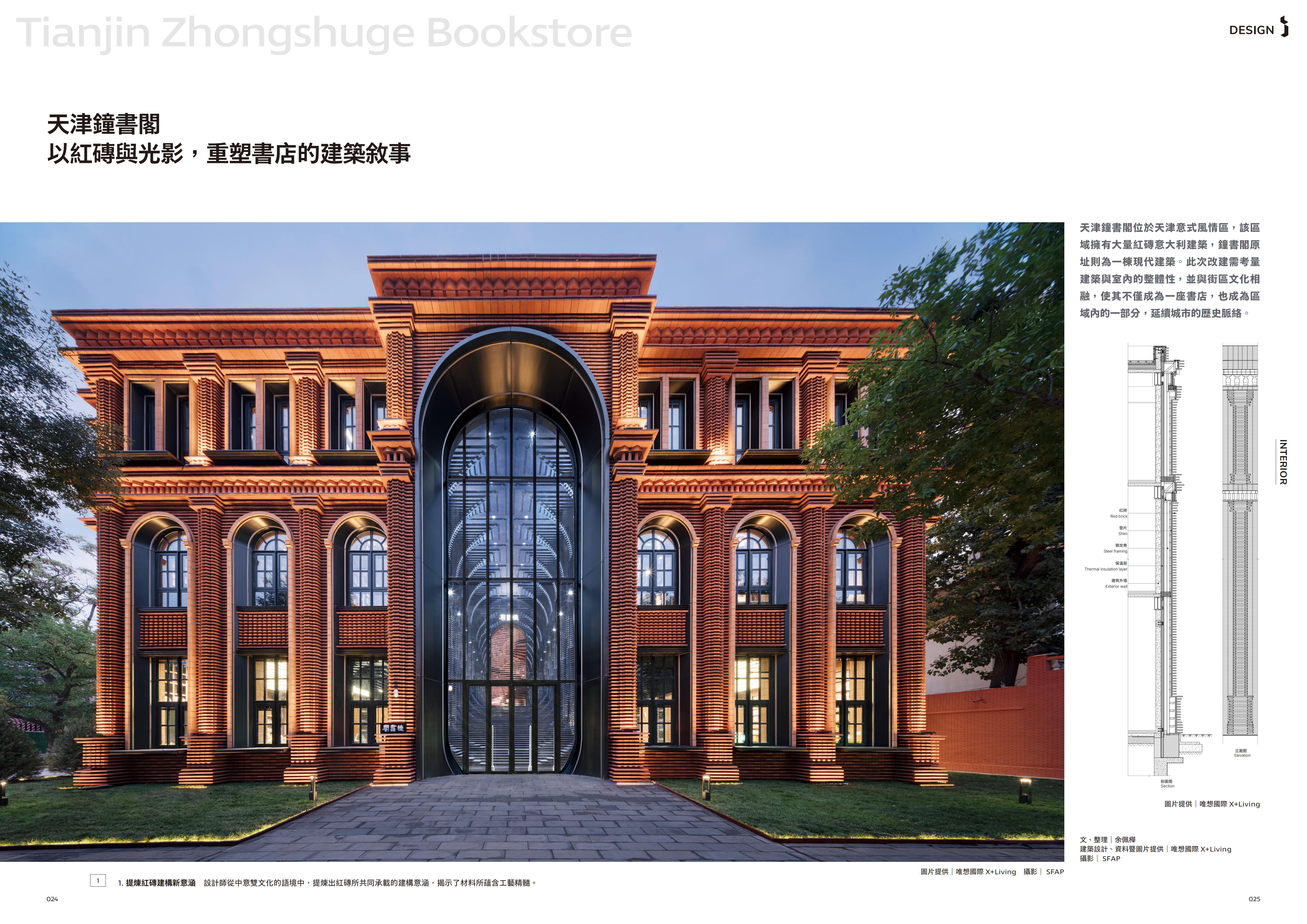 项目位于天津市意式风情区,周围林立着以红砖为特征的意大利百年建筑群落,原址是脱离周围古典语境的现代建筑,天津钟书阁需要将之重新改建。这不仅要求单体建筑与室内设计的一体化考量,同时要契合街区文化氛围。