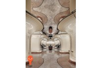 The entrance corridor is paved with Cloudora Gray marble. The undulating arcs on the floor and ceiling are outlined with black lines, resembling a row of annotations on the edge of a book page. These lines not only guide the flow of people inward with their gentle curvature but also engage in a visual dialogue with the winding garden paths in the public areas of the same floor.