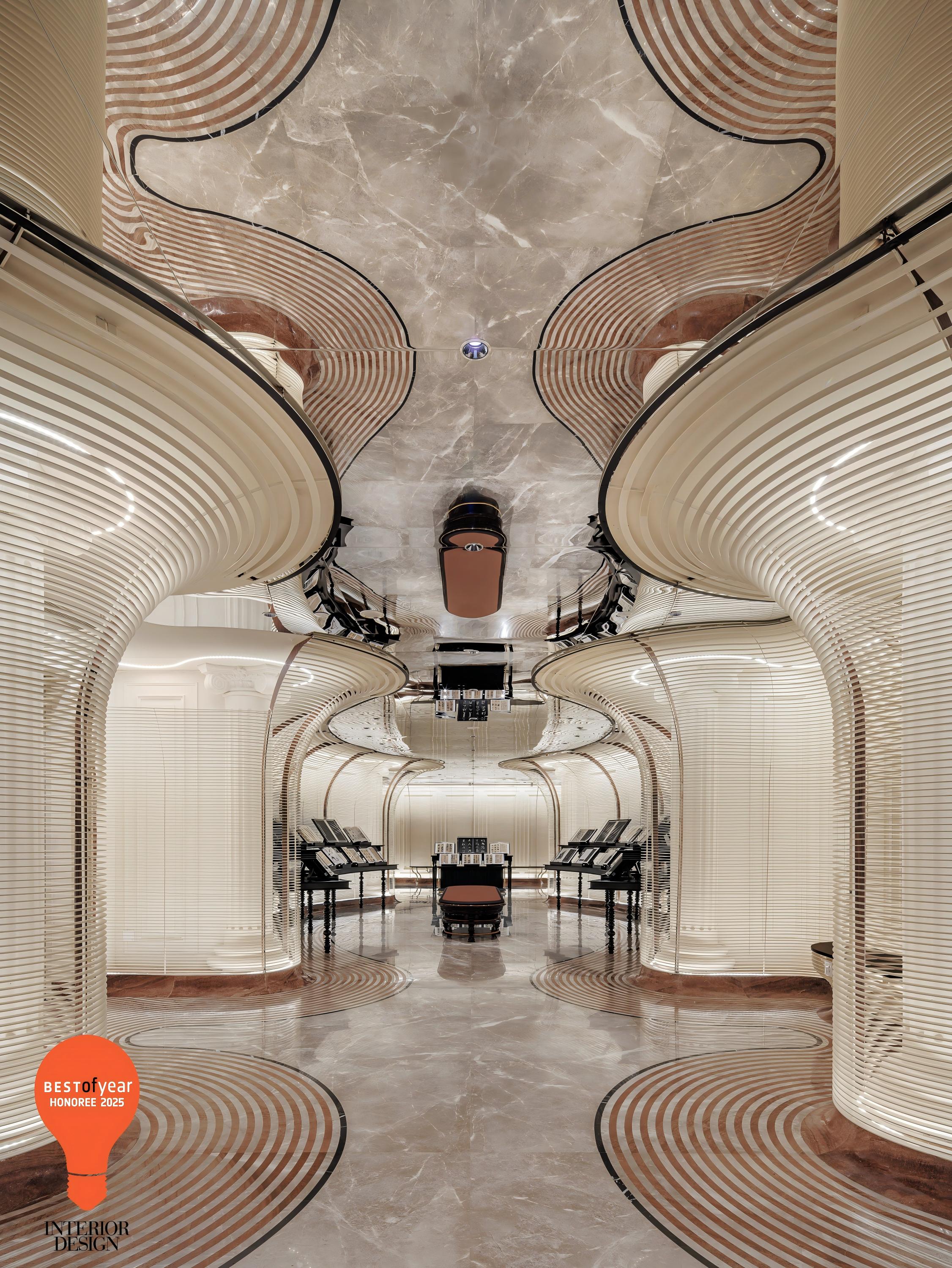 Three display zones are arranged progressively along the corridor, simulating the unhurried rhythm of reading. The vertical zoning created by the architectural contours is connected by the undulating lines on the floor and walls, much like the natural rhythm of a brush stroke spreading across paper. The first and middle display zones are centered around rectangular seating, with double-layered arc-shaped display tables on either side, showcasing books. The books on the shelves and the resting benches serve as mutual annotations, making the act of stopping to flip through a book a part of the spatial narrative. The curved surfaces of the display tables are meticulously crafted to precisely match the wall curvature, forming an embracing space. A resting area is placed between the two display zones as a transition. The final display zone centers around a bookstand, with resting seats along the wall.