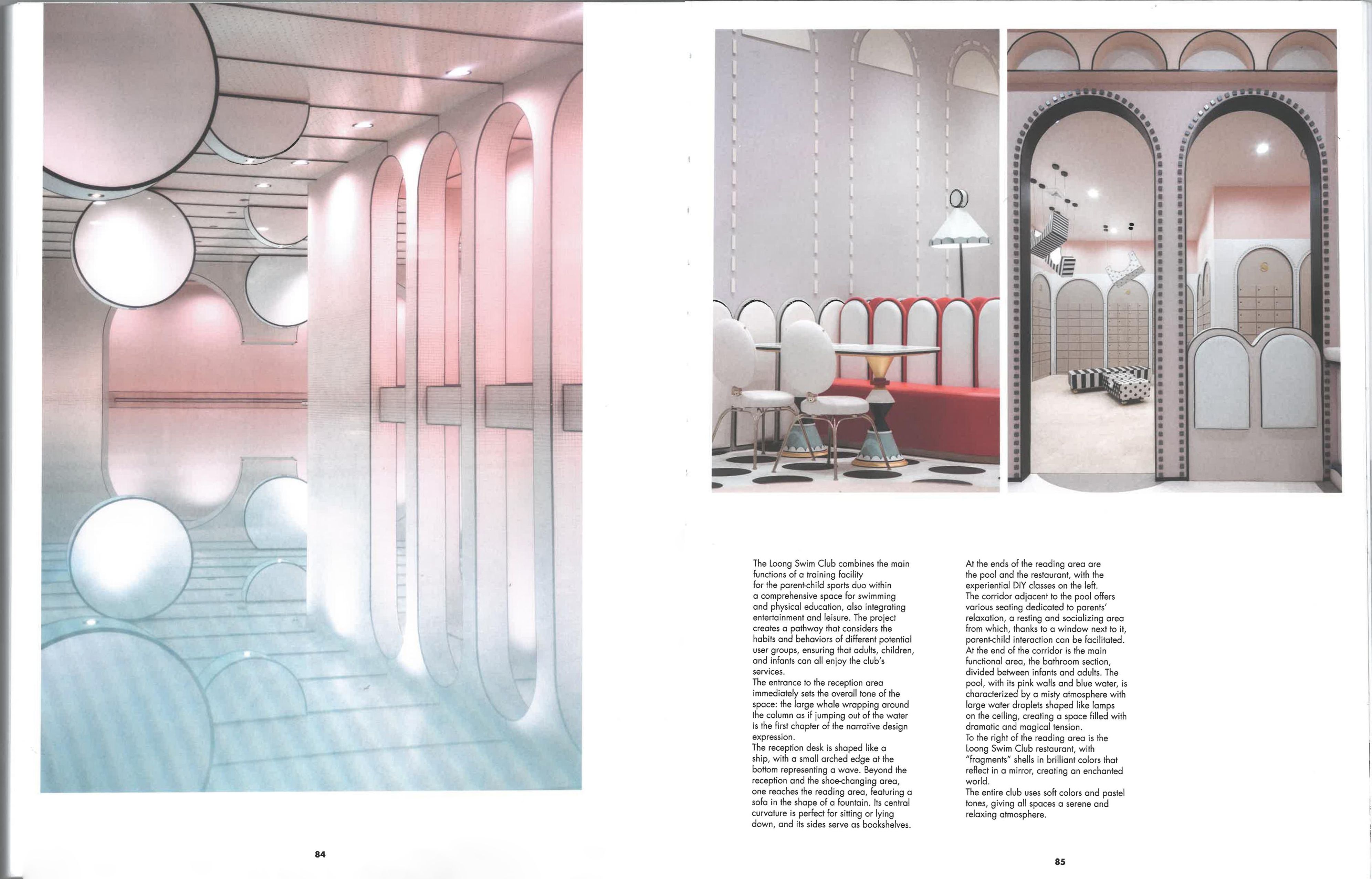 整个空间无不紧扣游泳馆的标志性元素——水,来进行设计思维上的发散。水是至轻至柔之物,水又拥有着孕育生命的无限包容力。将这份柔捏合进空间的纹理,设计元素的组合便像水波漾开一般自然而然地流淌在空间之中。