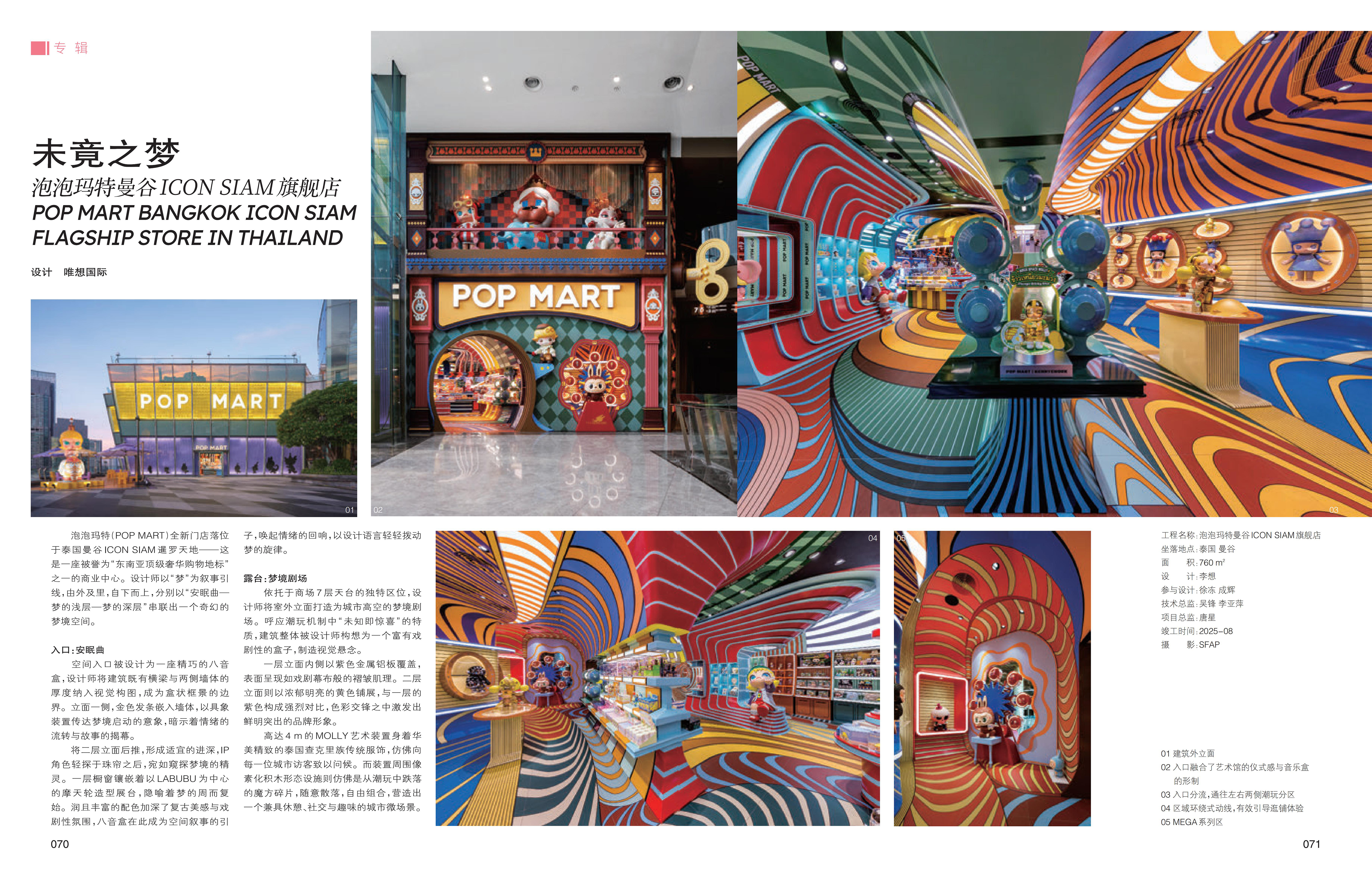 泡泡玛特曼谷ICON SIAM旗舰店的设计,是设计师在空间内撰写的一段奇幻叙事。在游历过层层梦境之后,人们醒来,回到现实。但现实并非梦的对立面,而是它的延伸与回响。空间中所经历的奇遇、所感知的色彩与情绪,不会随梦境消散,而是以另一种共鸣长久地留存。