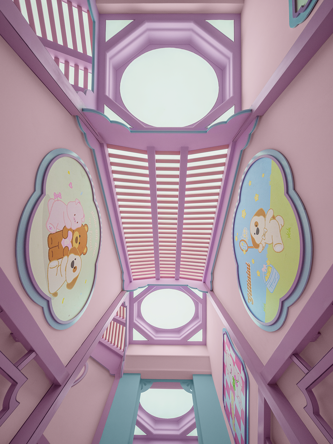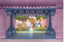 朱红立柱、灰瓦梁顶锚定夫子庙的历史文脉,柱梁间跃动的幻彩语言打破时空壁垒,古建肌理与多巴胺色彩形成强烈反差美学。设计师以叙事性造景替代静态陈列,借城市文化符号,打造不可复制的场景稀缺性。檐角屏风式 LED 店招、窗洞内嵌数字屏,以数字媒介延伸公共互动属性;檐口、柱脚与灯笼间的品牌印记,让古今对话、商业与文旅在此共生共融,彻底从封闭卖场蜕变为融入城市文旅的开放景观。