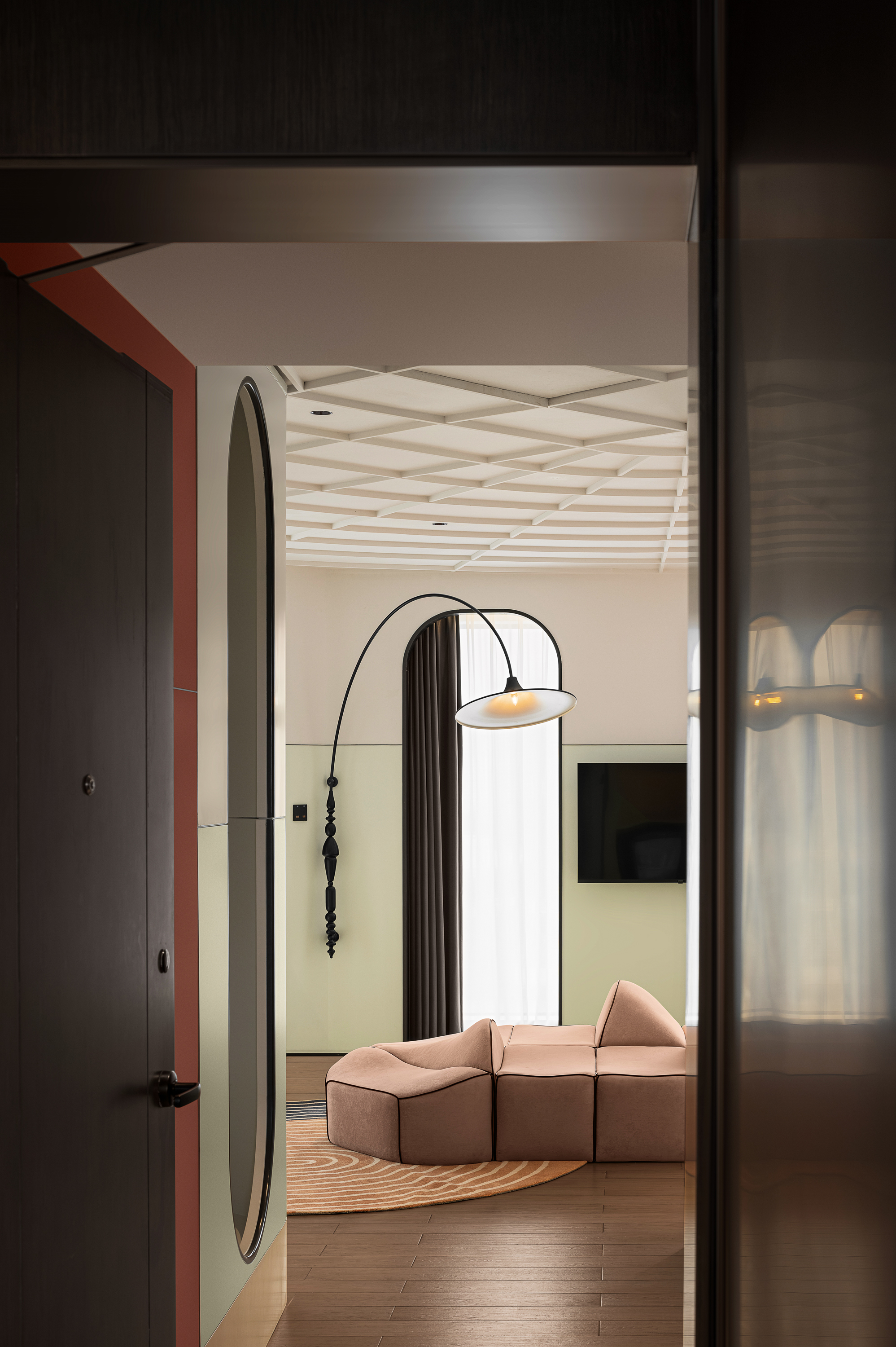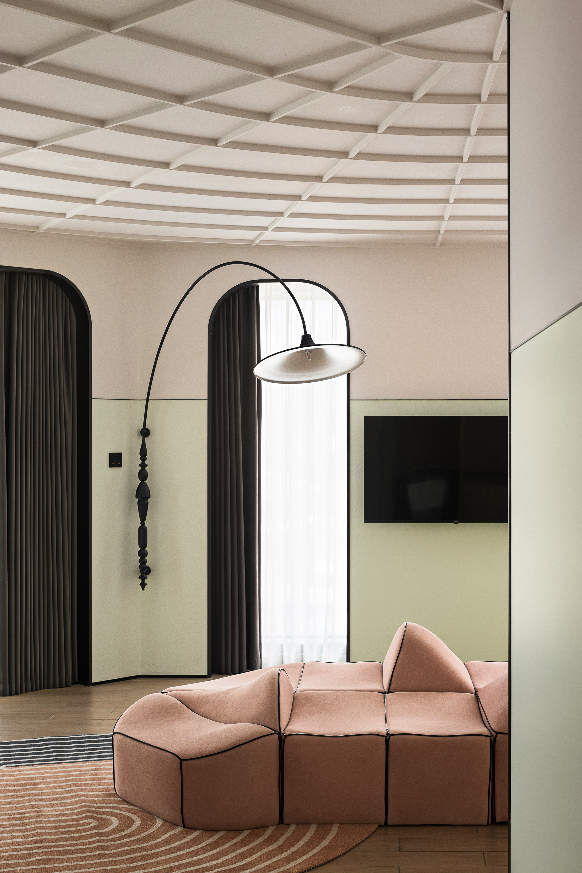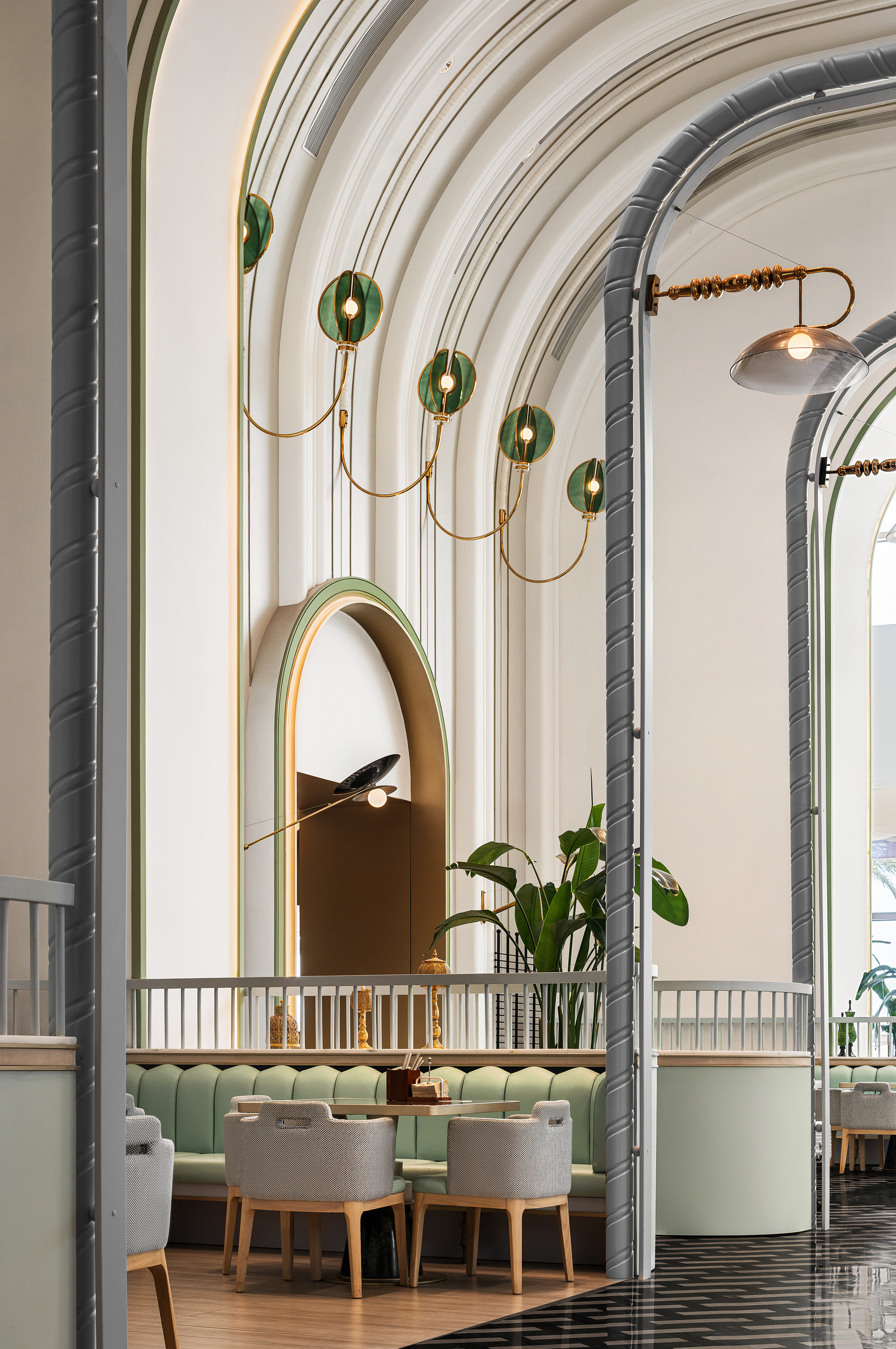 拱体以白色网格的方式铺满天花。弯曲的灯形截取自这一几何语汇,镶嵌于浅绿墙体间,让梦境也拥有弧度。