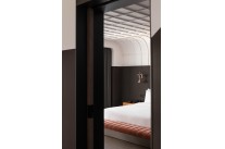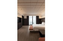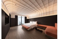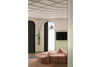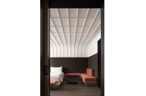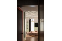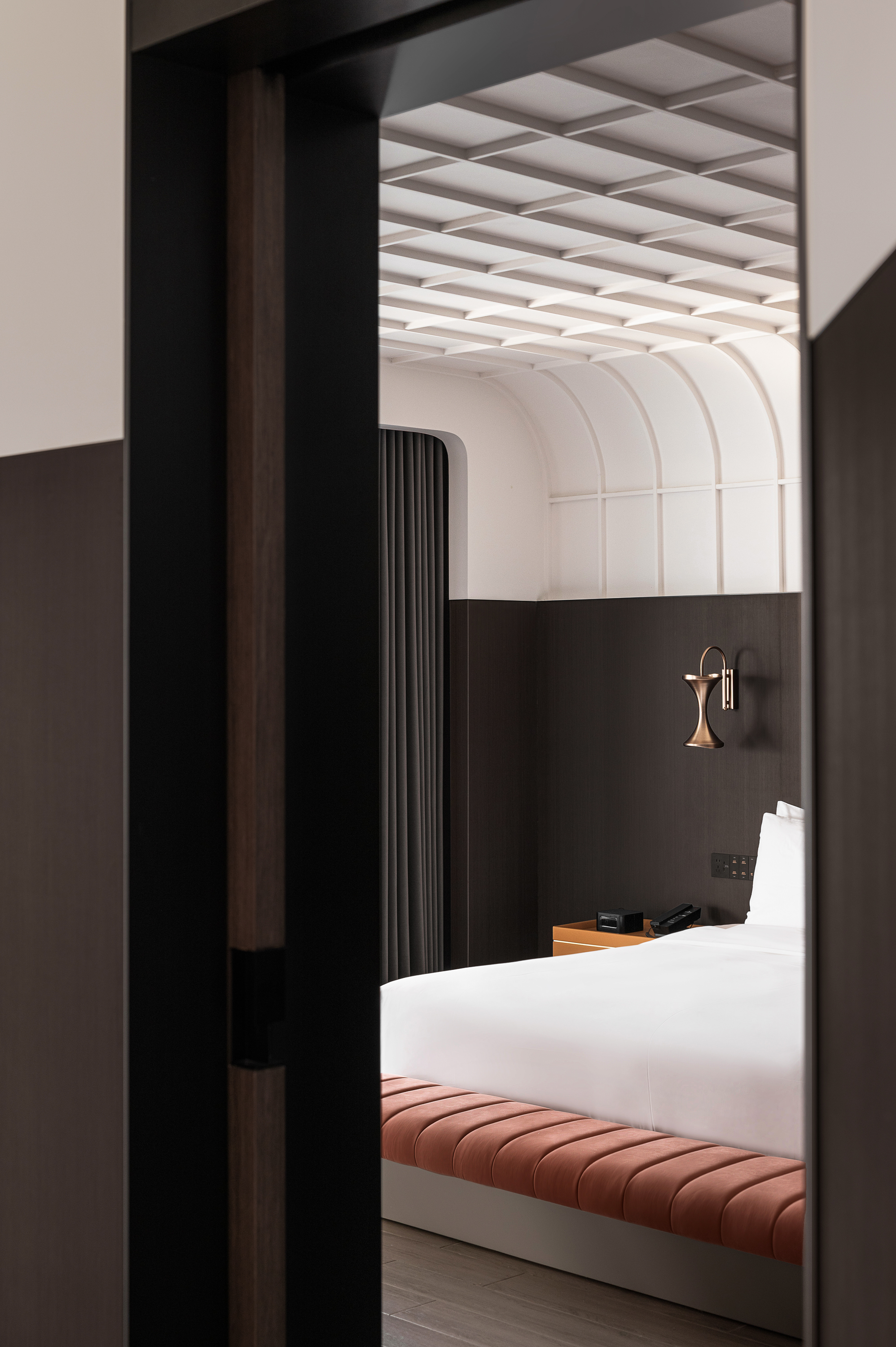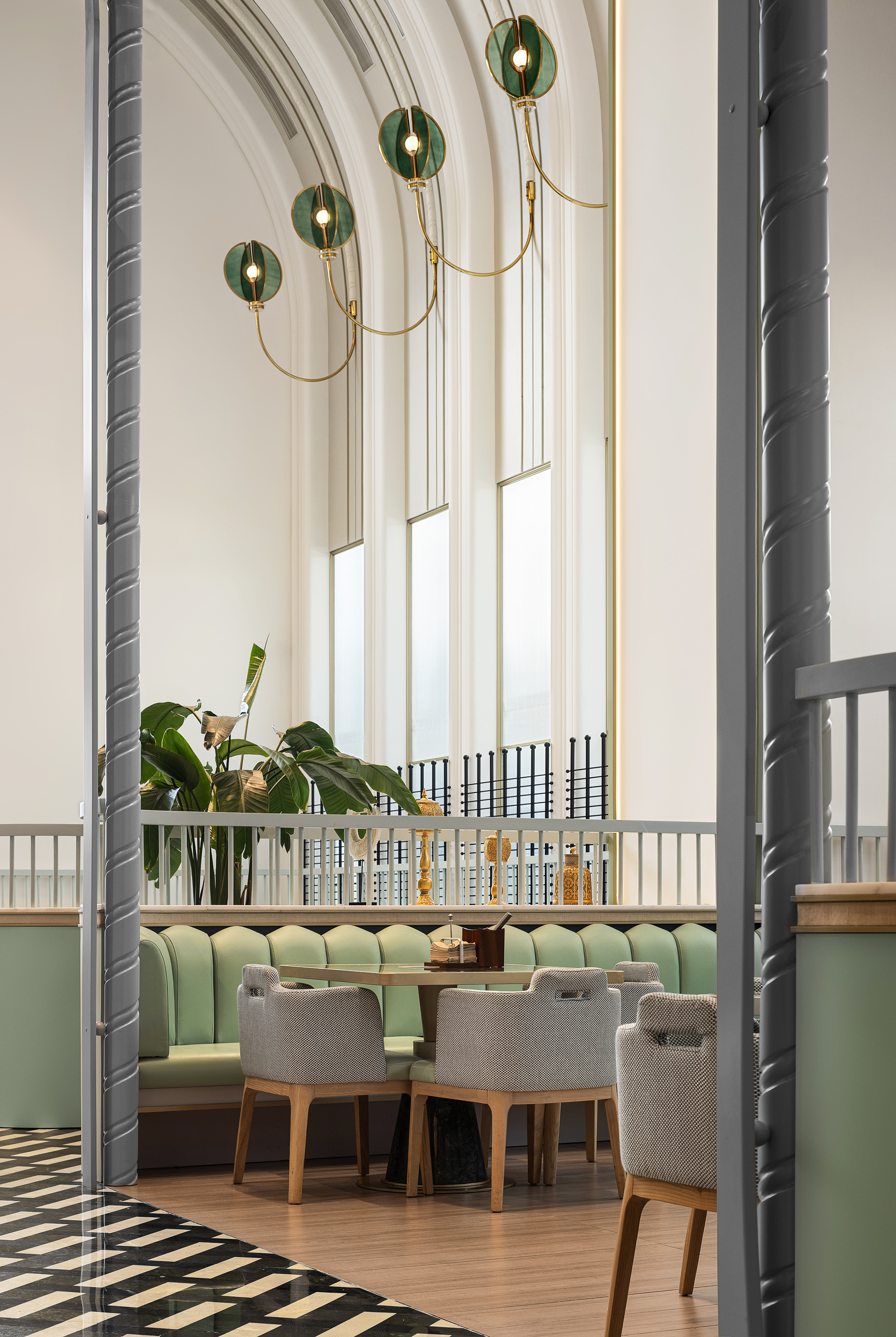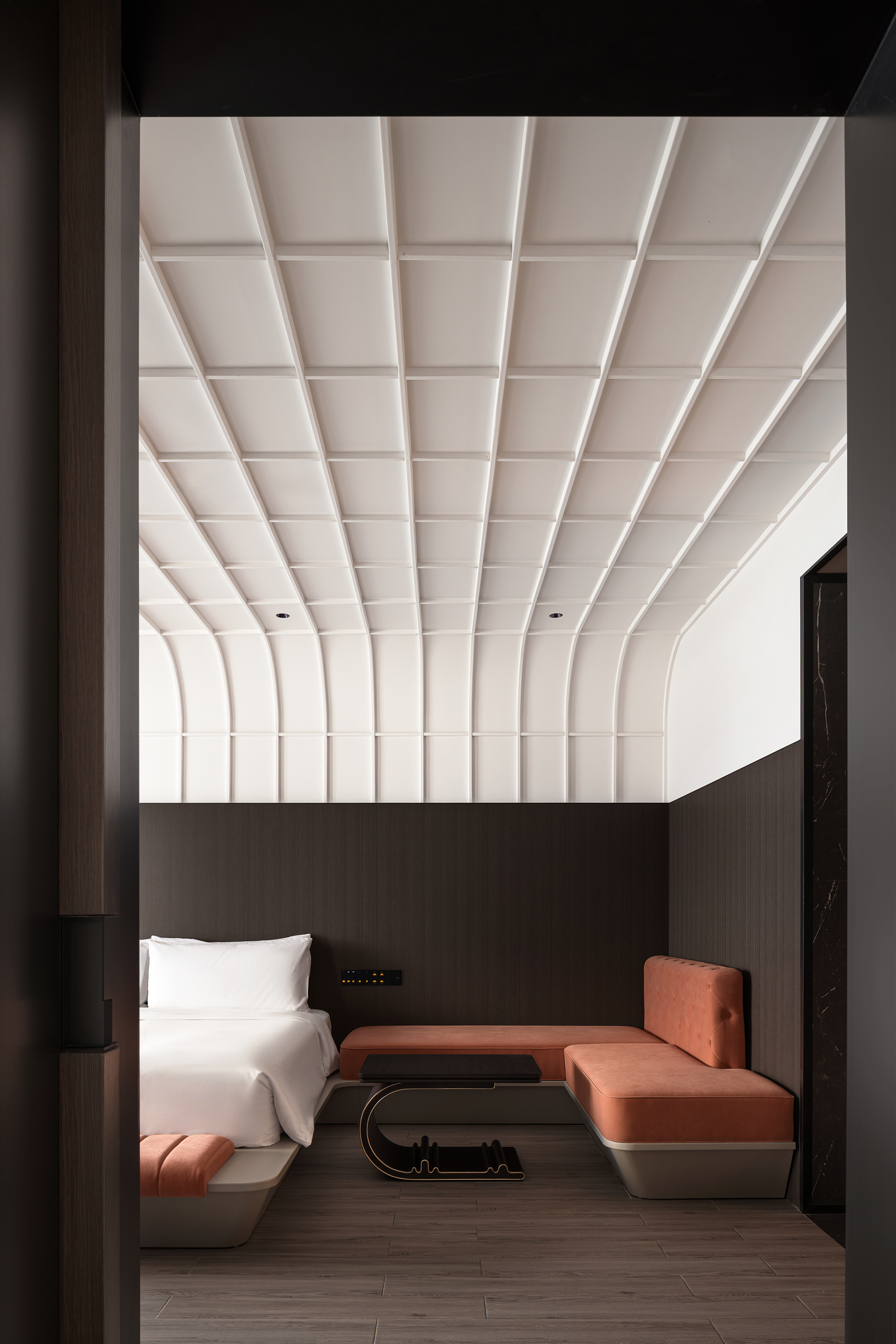 拱体以白色网格的方式铺满天花。弯曲的灯形截取自这一几何语汇,镶嵌于浅绿墙体间,让梦境也拥有弧度。