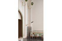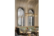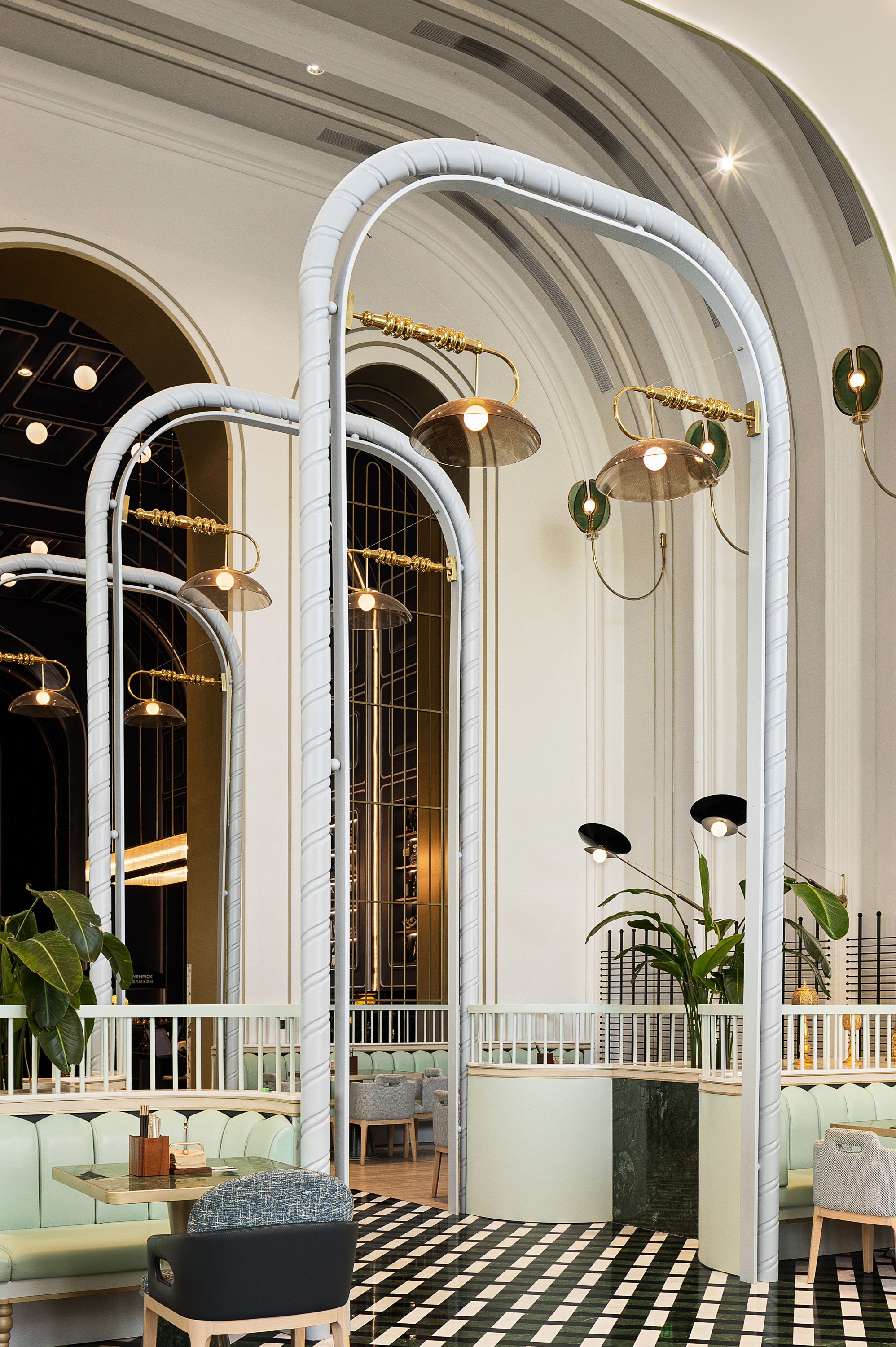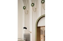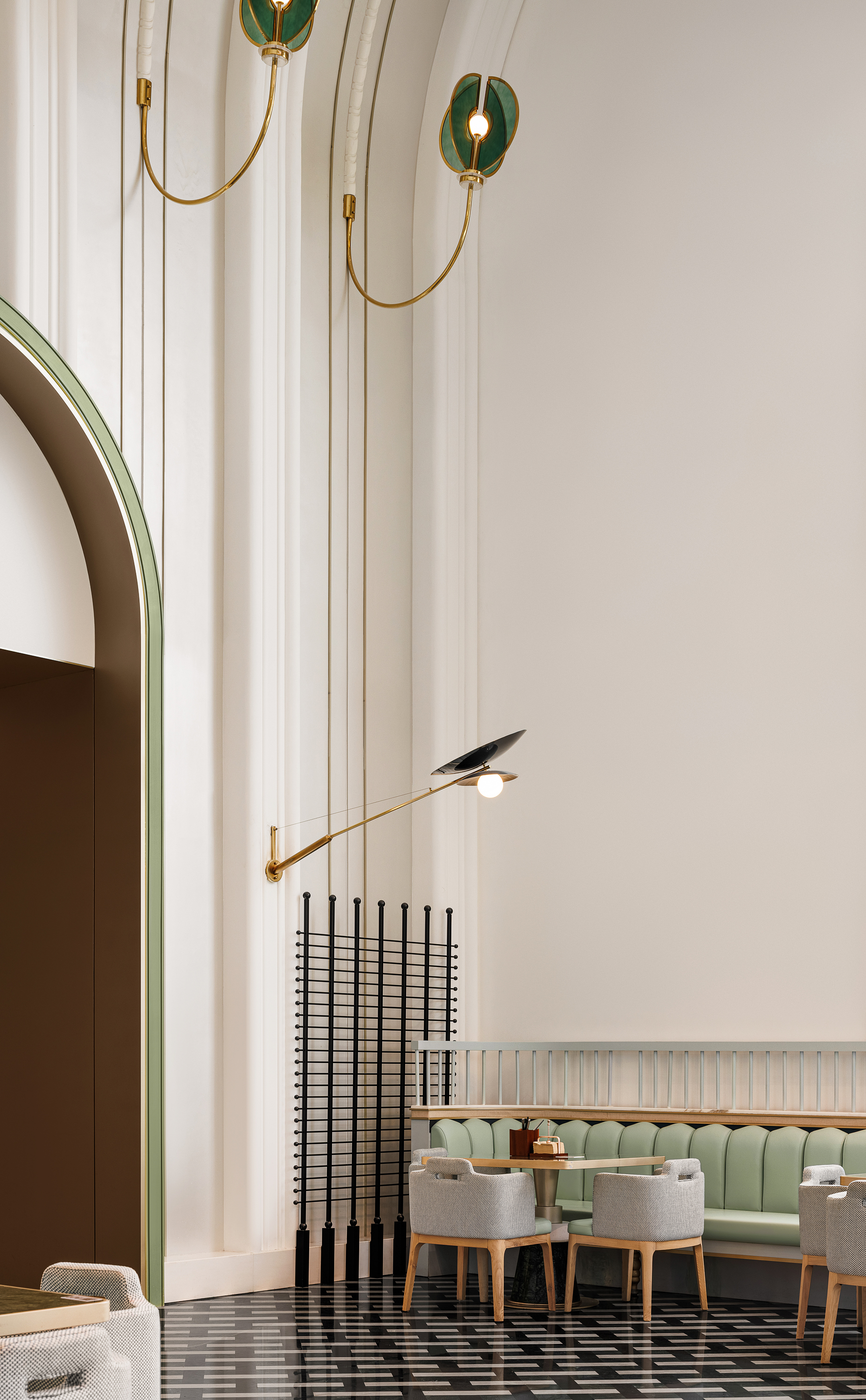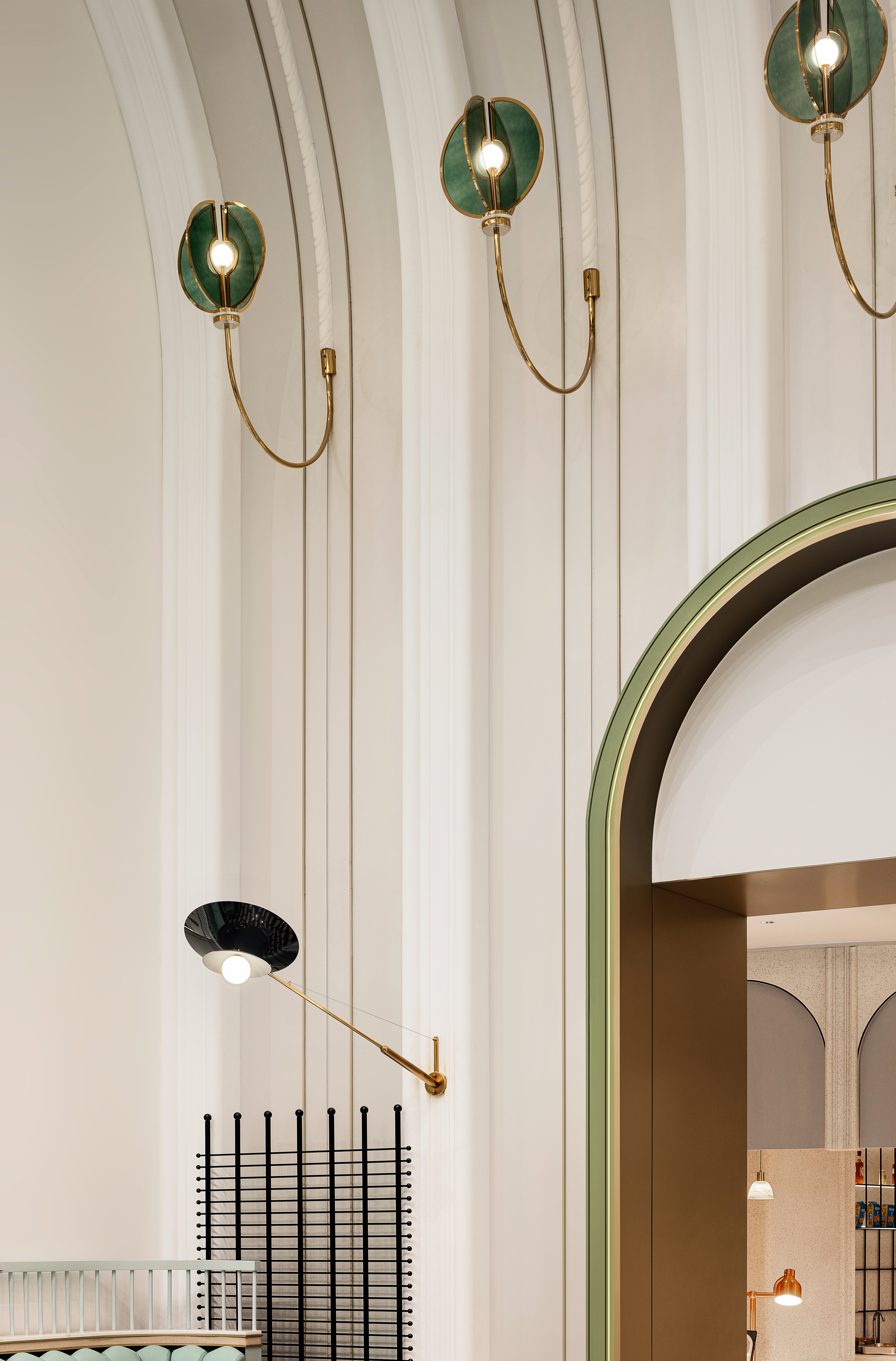 管状拱架按序列分布,翠绿壁灯是金色灯臂的轻盈落点。