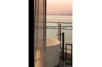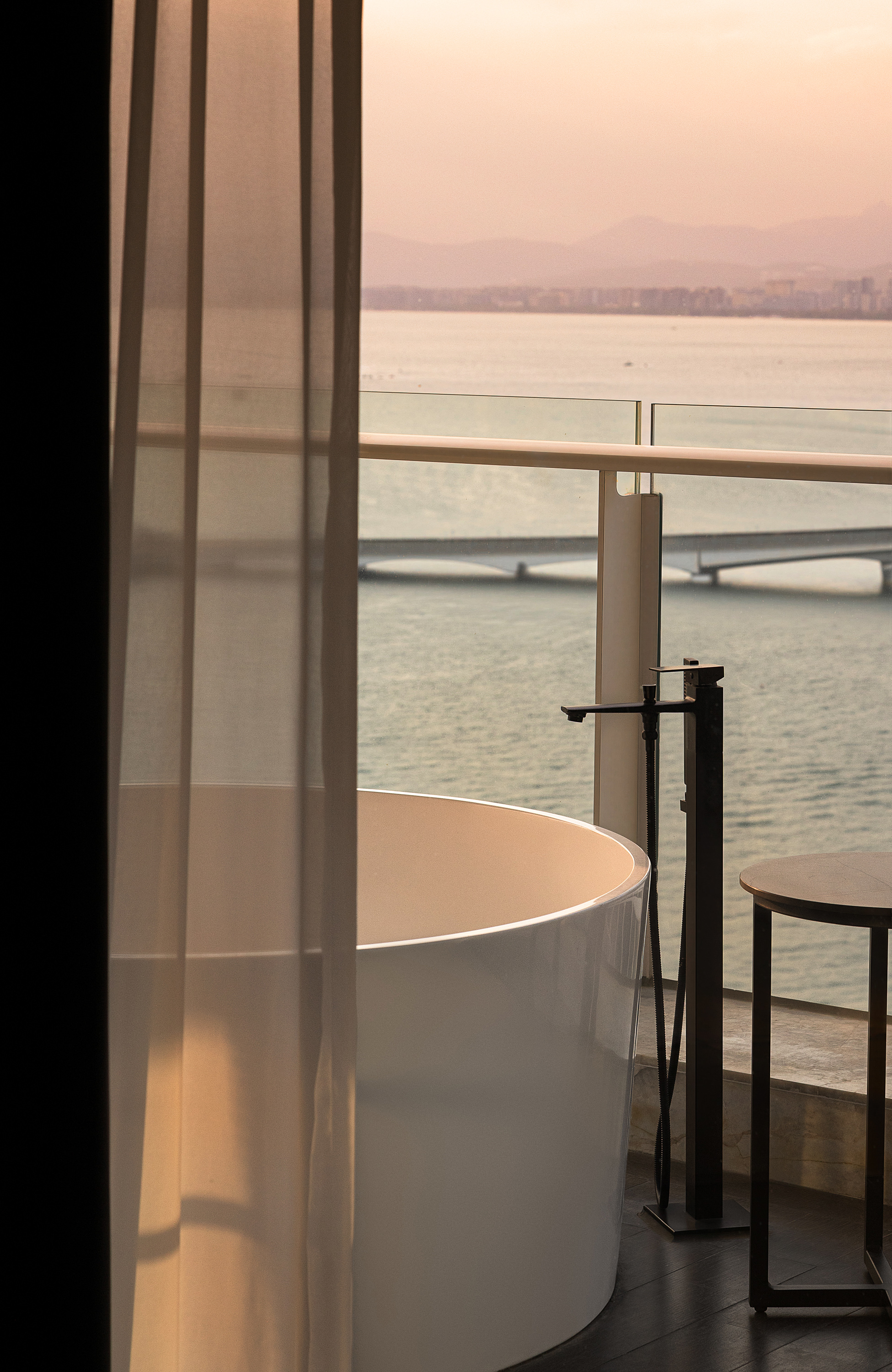 白色浴缸面朝大海,身体舒展,与自然完成对话。