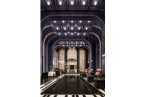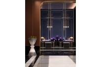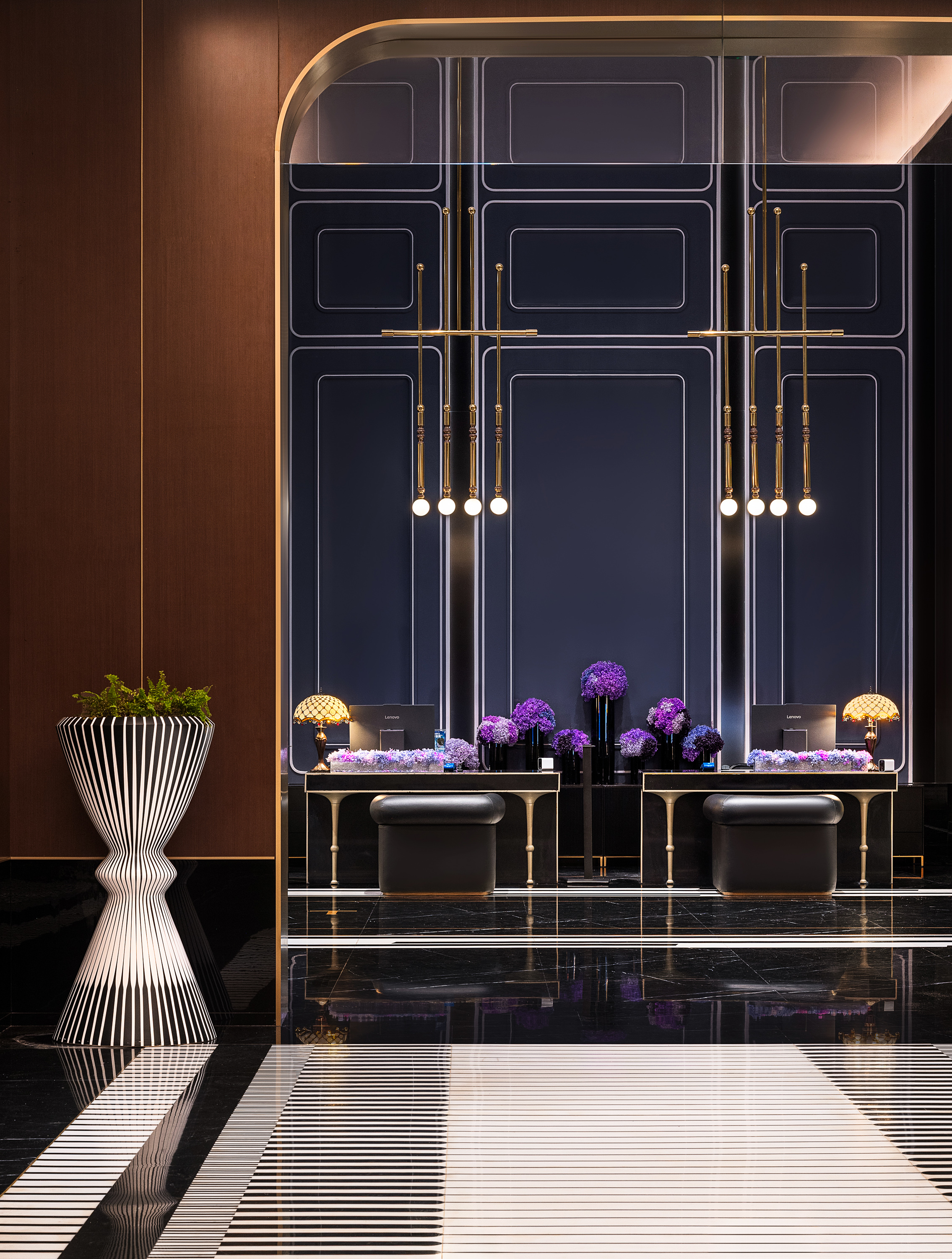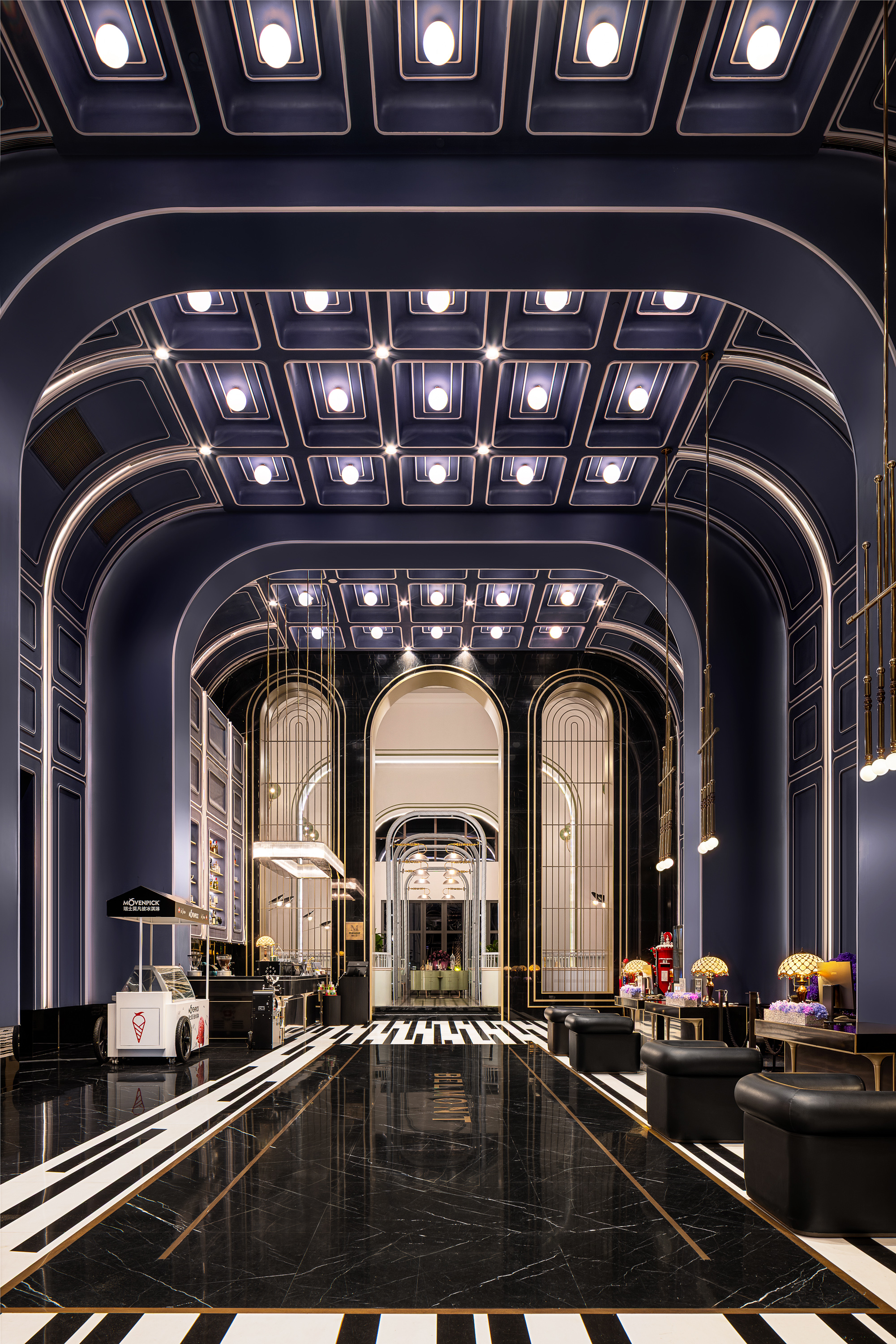 深海蓝的穹顶通向无尽的海之幽境。黑色大理石将光收进倒影,球形吊灯沿细黄丝线垂落,像悬在深海宇宙里的星系,自成一套昼夜系统。